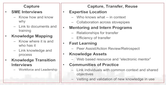 KM Tools and Techniques for Knowledge Capture, Transfer, and ReuseThe following slide is featured in Bill’s presentation, “Managing the Risk of Knowledge Loss Due to Work Force Attrition,” for the National Association of State Procurement Officials’ 2008 Annual Conference.