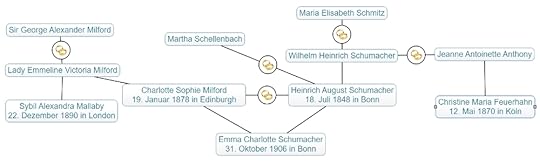 Nicht ganz unwichtig für uns alle ist es ja, wer uns großzieht und in welchen Verhältnissen wir aufwachsen. Dasselbe gilt für Emma, die aus einer bunten Familie stammt, deren Wurzeln in Deutschland, England, Schottland und Frankreich liegen. Damit nicht genug, waren sowohl ihr Papa als auch der Großvater und sogar Tante Sybil je zweimal verheiratet – das mag irgendwann einmal eine Rolle spielen, ja nachdem, was mir für Emma einfällt in der Zukunft.