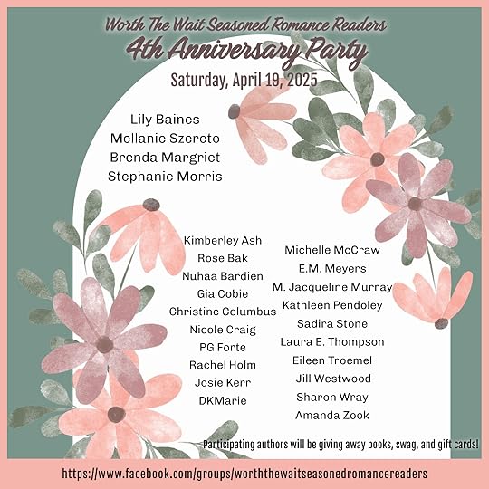 3Worth the Wait Season Romance Readers 4th Anniversary Party I’m so excited participate in this Facebook group party! So mark your calendar for April 19. The Worth The Wait Seasoned Romance Readers Anniversary Party is the place to be if you want to hang out with authors, win free books and swag, and just have an awesome time. I hope to see you there!