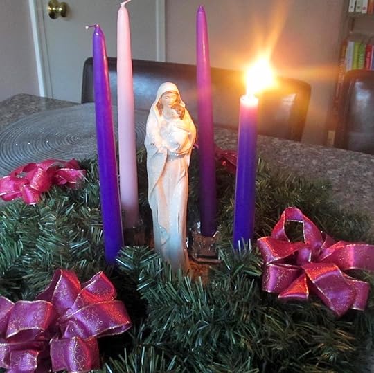 Advent Wreath #1My first advent wreath sits on my kitchen table. It’s a simple wreath of greenery with four candles, three purple and one pink. We light the first candle on the first Sunday of Advent, then each week add another candle, allowing the day’s lections to guide us towards Christmas day. Purple is a penitential color, reminding us that the celebrations are yet to come–but not yet. And the pink candle, lit three weeks into Advent, is for Gaudete Sunday. Gaudete, which means Rejoice in Latin, reminds us that in spite of the darkness, joy is coming soon.