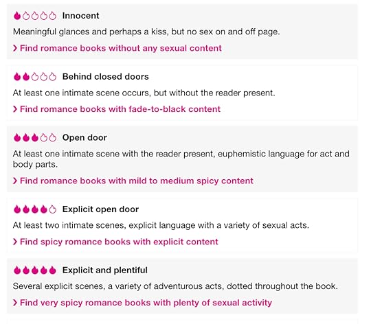 Different Charts, Different LanguagesHere’s the perfect example. The first chart organizes romance into five categories ranging from Innocent (no on-page intimacy) to Explicit and Plentiful (frequent, graphic intimacy). This chart comes from from the website romance.io: