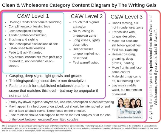 But the second chart, designed for the Clean & Wholesome category, uses three “levels” that focus more on the intensity of physical contact and description. Michelle over at The Writing Gals made this three-level scale for clean and wholesome romances: