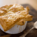 PrintThe Hungry {Romance} Writer: Beef Pot PiesI received this recipe years ago from one of my sister-in-laws and then adapted it for my own family. I added the carrots and took out the mushrooms, and I added more tomato sauce because I thought it needed more liquid. The filling can be made the day ahead and then assembled the next night for dinner. The pastry dough needs at least 20 minutes to defrost before it's pliable enough to roll out. But if it defrosts for too long, the pastry won't puff. Course Main CoursePrep Time 35 minutesCook Time 20 minutesTotal Time 55 minutesServings 4 peopleIngredients1 pound ground beef1 Tablespoon extra virgin olive oil1 small Vidalia onion finely chopped1 teaspoon minced garlic1 Tablespoon dried parsley1 teaspoon dried oregano8.5 ounce can of no-salt added peas drained8.5 ounce can of carrots drained8 ounce can tomato sauceKosher salt & ground pepper to taste1 cup shredded cheddar cheese1 sheet Pepperidge Farm frozen puff pastryInstructionsPreheat oven to 350 degrees F.Take out 1 sheet of puff pastry and place on the counter to defrost.Line a baking sheet with tin foil and place 4 1-cup ramekins on the sheet. Set aside.In a large skillet, brown the ground beef. When the beef is cooked, use a slotted spoon to move the meat to a bowl. Set aside.Pour out most of the pan drippings. Add in 1 Tablespoon of olive oil and heat.Saute onions until lightly browned, about 10 minutes.While the onions are cooking, drain the peas and carrots. If the carrot pieces are larger than 1/2″, then chop the carrots. Set the peas and carrots aside.When the onion is beginning to caramelize, add the garlic and sauté for 3 minutes.Add in the peas and carrots. Then stir in the beef and tomato sauce.Stir in the oregano, parsley, salt, and pepper.Bring mixture to a boil and reduce to a simmer for 15 minutes to let the flavors blend. Adjust seasonings as necessary.While the mixture is simmering, roll out the pastry dough on a lightly dusted counter. Roll it into a 14″ x 14″ square. Cut into four equal pieces. Cut a small vent hole into the center of each pastry square.Evenly divide the meat mixture and spoon into the ramekins.Divide the cheese and sprinkle over each ramekin.Place a square of pastry dough on each ramekin and press around the edges to seal. Make sure you have a small vent hole in the center.Bake for 15-20 Minutes, until the mixture is bubbly and the dough is lightly browned and puffy.Serve immediately.