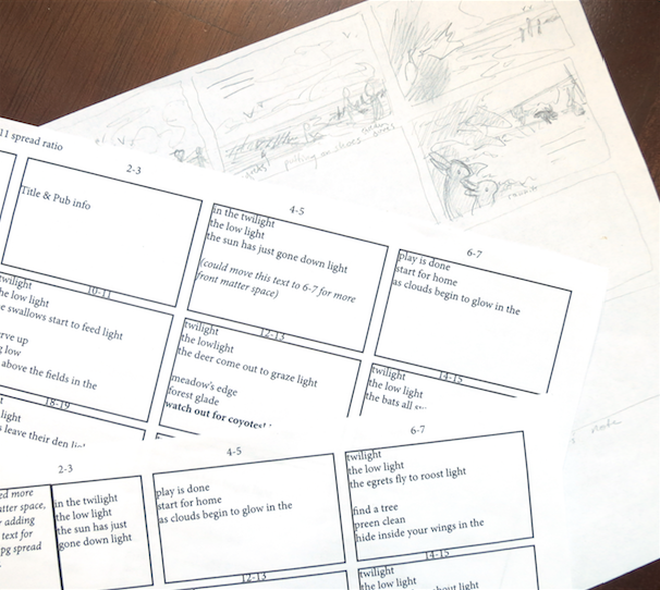 Working on the pagenation, initial thumbnails.My lovely agent, Jen Rofé, sent me the manuscript for TWILIGHT CHANT in the spring of 2016, and as I read the soft, rhythmic language of the poem I immediate...