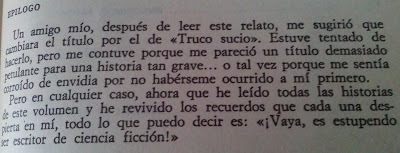 Algunos relatos tienen un breve prólogo y/o un epílogo, y traigo aquí los del último relato, La bola de billar, porque no tienen desperdicio. En el primero nos cuenta la ilusión que le hizo recibir el Hugo, y en el epílogo exclama “¡es estupendo ser escritor de ciencia ficción!”. Desde luego que es estupendo escribir ciencia-ficción, doy fe de ello, y también es estupendo leer sobre ello cuando el autor es un genio en su campo, como ocurre en este caso. Incluso cuando el relato no deja de ser correcto a secas, le da cien vueltas a otras cosas que publicaron otros autores, de ese género o de cualquier otro.