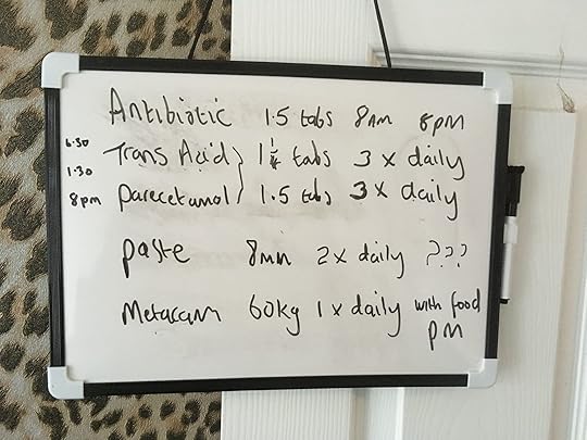Instead of picking Cookie up on Friday we got a call to say she was staying in an extra night. Tom the vet explained that the anaesthetic that is used to numb the leg can often stay a little longer in the bigger dogs and at the moment she was still dragging it. As a precaution he'd rather keep an eye on her for a little longer and whilst we were obviously disappointed you have to admire the professionalism and commitment to the animal's welfare, and know absolutely that it's the right decision.Saturday was a case of waiting for a call again and when it came at around 11am we were told she was doing really well and was ready for discharge. We were offered 12 or 2pm and though we are about 45 minutes away there was no real choice and we jumped in the car within five minutes of putting the phone down.Tom wasn't on duty but the vet who went through everything with us was what we'd come to expect from this top class establishment. He explained everything slowly and you never felt like you were being rushed. He answered all our questions, went through the medication one at a time and when we were happy he brought Cookie through. It goes without saying we were delighted to see her but we didn't want to get her too excited so we got her carefully in the car and headed home to get her settled. Unfortunatly she had a stomach upset again and we have been unable to give her the Metacam so pain relief is down to the Paracetamol and Codeine alone. Despite being obviously uncomfortable she had a really good night and just seemed very happy to be home.Now it's the recovery and the management of everything that involves will be our biggest challenge. We have had lots of advice from those who have been there before and the advice from those with experience is invaluable. One of the tips was the Help'EmUp harness and I can't even begin to say how useful this has been so far. I know I've mentioned it previously but it is an Absolutely brilliant piece of kit .The medication alone is a challenge and the whiteboard usually reserved for work now resembles and ER station. Cookie is confined to small room rest for two weeks and then can begin light lead exercise of 10 minutes 2 to 3 times a day. We are very lucky that when we built the extension on the house it was with the dogs in mind. We have rooms that easily divide just for this type of thing so Cookie has her own space with direct access out to the toilet with no furniture to tempt her and she can still see Monty without them being physically together. So we have the room sorted the medication organised and now to try and keep her occupied. We had the wonderful snuffle mat sent to us by Stacey from My Fab Dog and she has certainly got some use out of it already and it's definitely going to be a firm favourite over the coming weeks. We also have the old favourites that are the Kong's and she's already had a Sweet Potato, Yoghurt and kibble one to keep her occupied but Kong recipes are always very welcome.She is currently snoring very contentedly a few yards away from me as I type this, so I'm very happy to report that it's so far so good, and hopefully now she'll go from strength to strength....