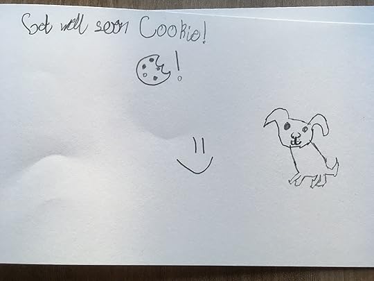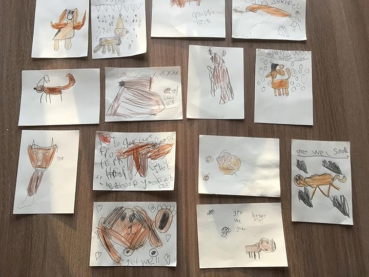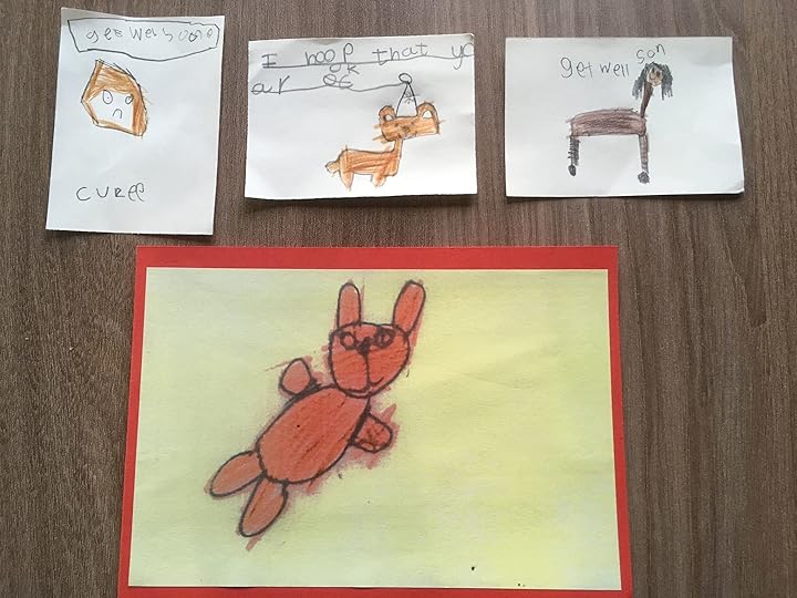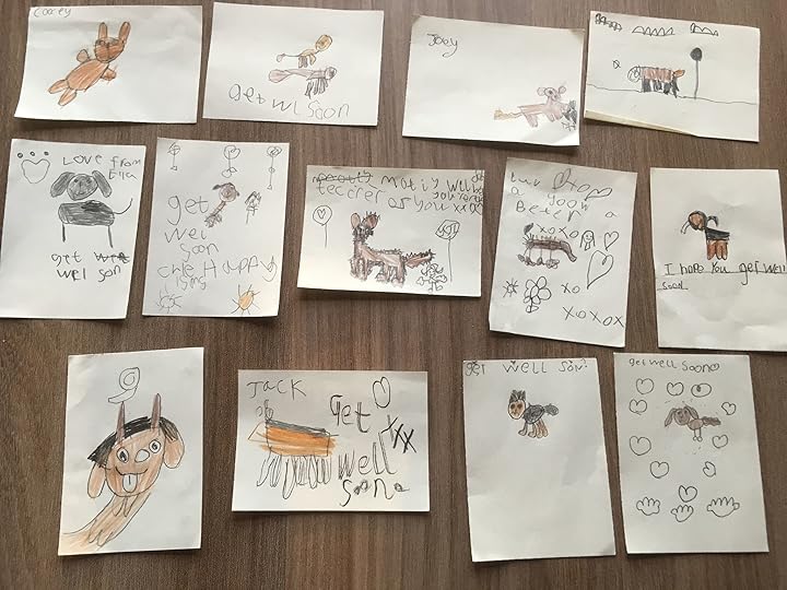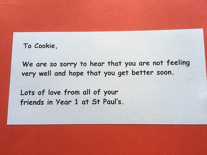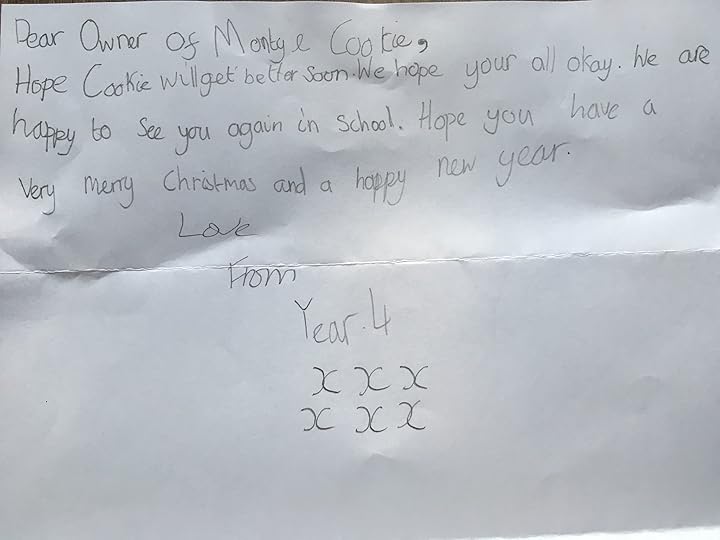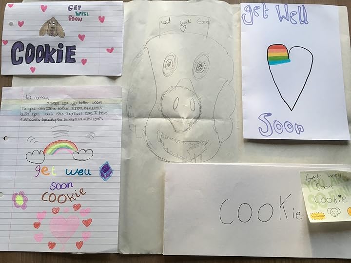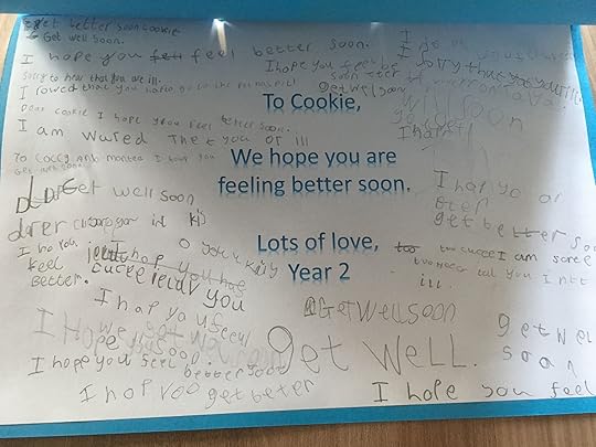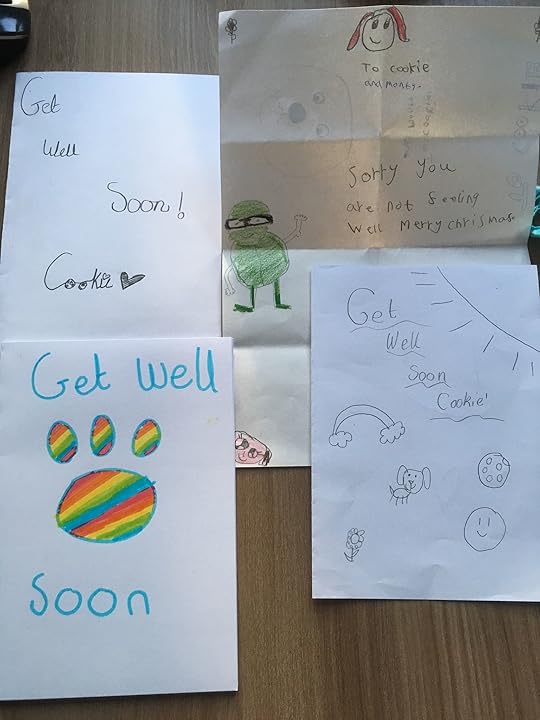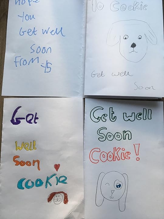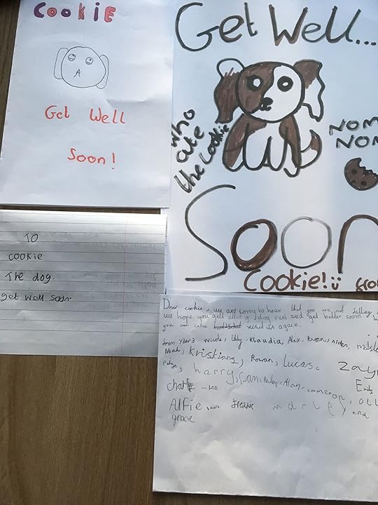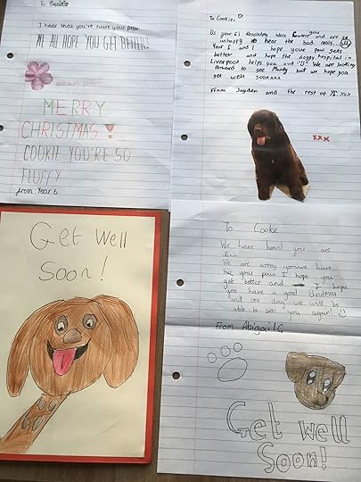 We visited St Paul C of E school in Wigan on Thursday. It had been arranged a while ago as the official launch of the Christmas book. St Pauls is a school we love visiting and it's our third trip there, twice with Monty and once with Cookie.I rang them on Wednesday to say I would still be coming but needed to leave at lunchtime and explained what had happened with Cookie.I read the book to each year group one after the other and was absolutely blown away when a child from each group came up and gave me their good wishes for Cookie.I learnt afterwards that as soon as the children heard that Cookie had hurt her leg they wanted to do something to let her know they were thinking of her.Well you can imagine how moving it was and such a beautiful and genuine gesture. I know we hear so much about the horrible things in the world I thought I'd share with you the innocent love and warmth of children towards Cookie.
