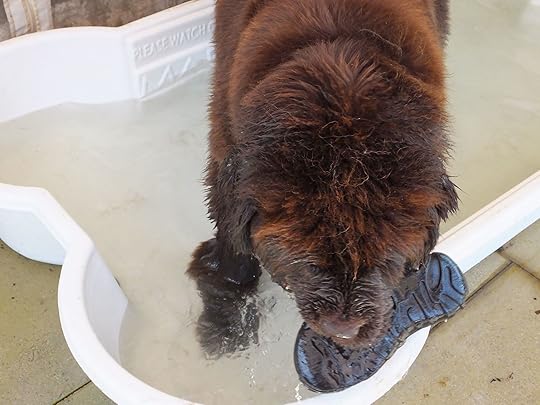 I know this is very hard to believe but the sun actually came out yesterday in Wigwam. It's not something that visits very often but it was really hot all day. I love sunny days cos if it gets really warm we get let off a walk and so yesterday it seemed like a day of snoozing was on the cards.Little did I know that mum had decided to take the opportunity of a rest day to do some....grooming. Well after walking me least favvyreet fing is having a haircut and being brushed. The heffalump went first and I was hoping she was going to be really norty and mum would be fed up by the time she got to me and maybe just give up.No such luck though cos she was missy good girl and so mum was raring to go by the time she got to me and an hour later I had been brushed, trimmed, raked and brushed to within an inch of me skin. Even after this hair raising abuse I still wasn't allowed to rest cos dad then and went to get the pool out. Now you need to know that when water becomes involved the hairy hippo turns from bouncy brown destroyer to rocket fuelled spring legged low flying slobberbeast.....Her favvyreet thing is running at full speed and landing in the pool when I'm in there and then trying to dig me feet up wiv her mahoosive furry paddles. Then when I get out she comes and jumps on me until I play back. The only bit I really enjoyed is when she decided dad's shoe needed to be retrieved from underwater and then also decided that he was just too dry....mum by this point had disappeared....clever mum...