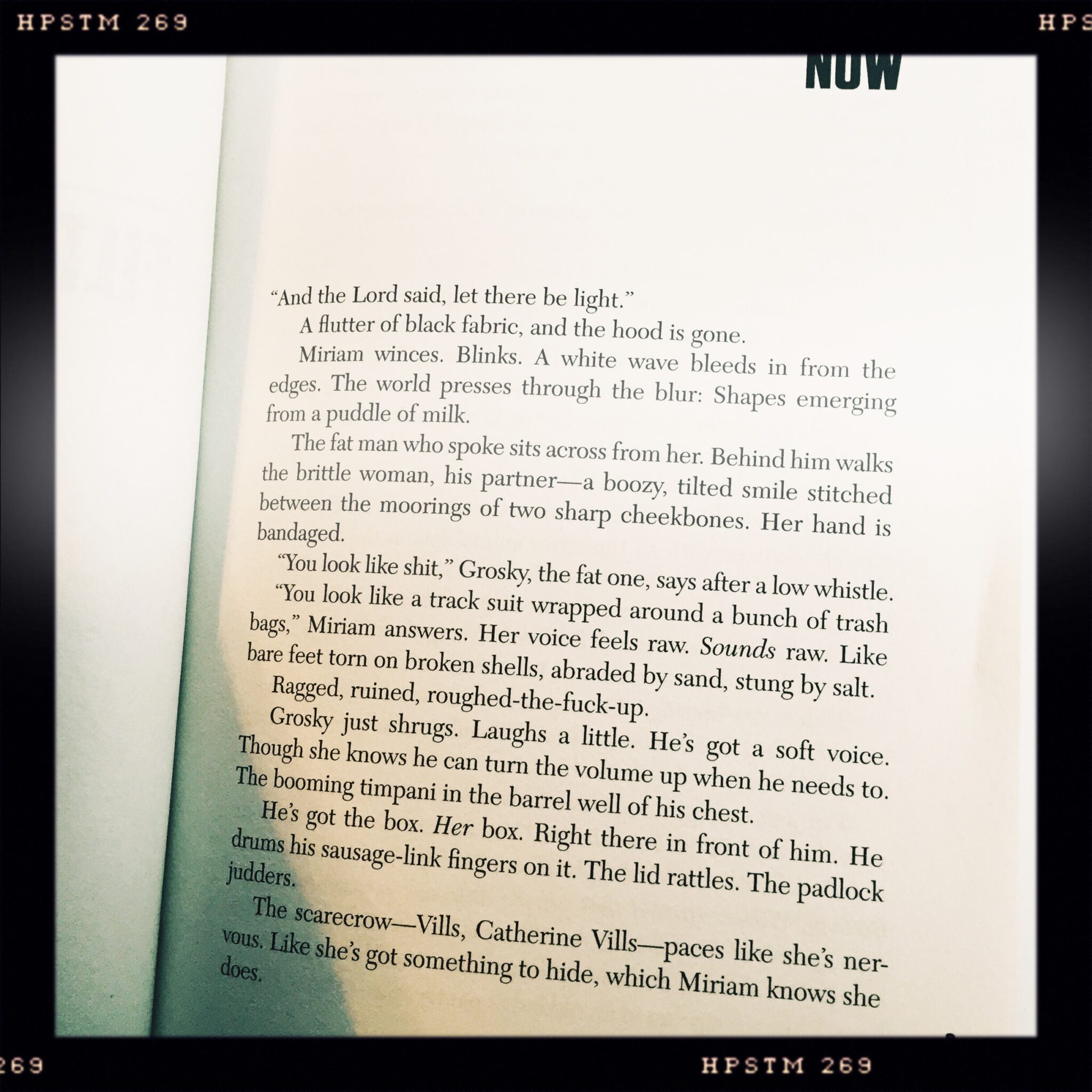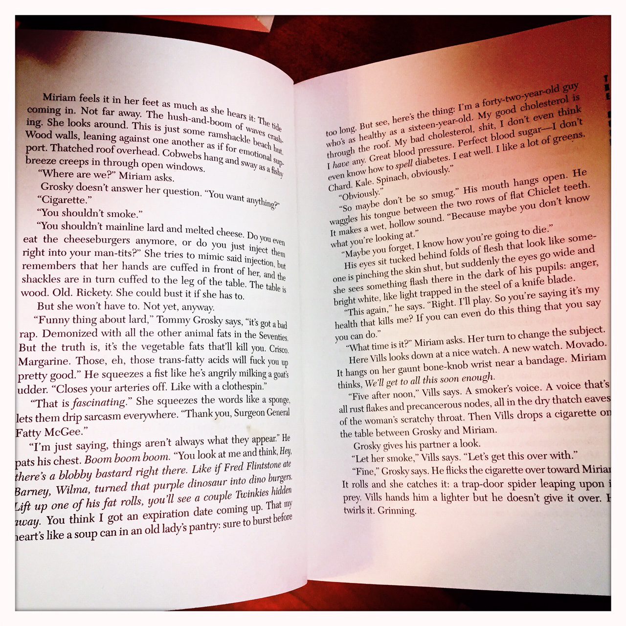 - I got to jigger with the timeline — these books have never been perfectly linear. The Interludes have always served as an opportunity to do flashbacks. But with The Cormorant, most of the book is nested as a kind of flashback into itself — it begins (see photo above) with Miriam held captive by two people claiming to be FBI agents (echoes there of Blackbirds), and then much of the story is them working through how she got there.
