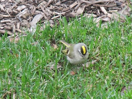 Walking home with my groceries today, I came across an active three or so Golden-crowned Kinglets. I stood very still on the path, thus this little guy went undaunted by my towering as he searched for food not many feet away.