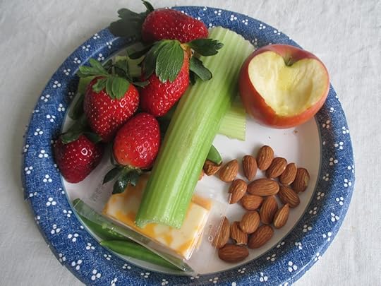Plain oatmeal with nanners or blueberries for breakfast. Apple, celery sticks, raw veggies for lunch. Salad, or steamed veggies with brown rice for supper. Grapes or orange for sugar tooth.