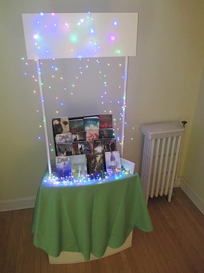 My pop-up bookstand is coming along! And it all fits in a few bags easily carried. I make my own magic, man! And you may think those are twinkle lights…but they’re fairies. They flew by to approve my shop.