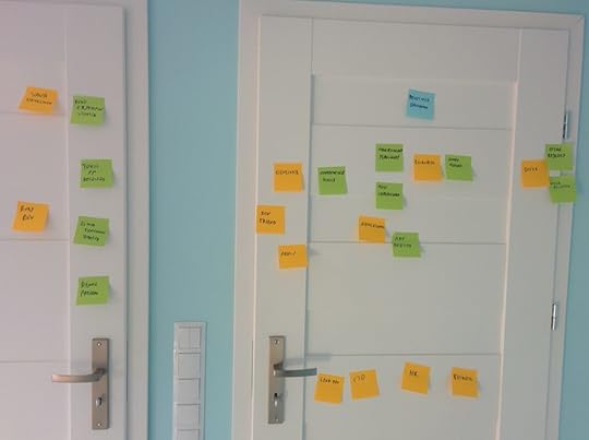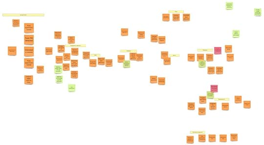 Następnie zaczęliśmy zapisywać zdarzenia, które mieliśmy w głowach. Pojawiły się też pytania, co sprowokowało kilka dłuższych dyskusji. Wszystkie pomysły w tej fazie postanowiliśmy dorzucić jako dodatkowe zielone karteczki. Jest to dobra praktyka, bo pozwala uwolnić w ludziach kreatywność. Po pewnym czasie nasza tablica wyglądała tak: