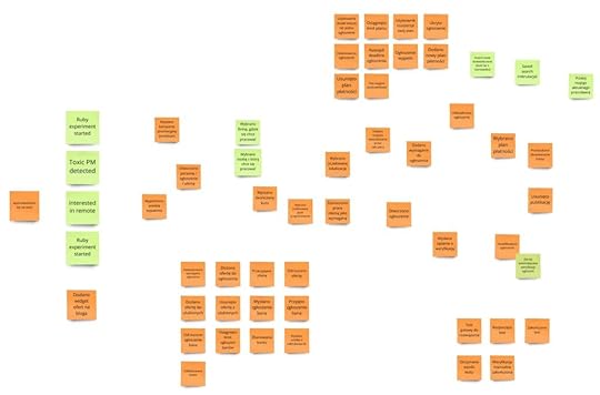 Pewnego dnia spotkaliśmy się z Andrzejem w jego domu pod lasem i podczas rozmowy padł pomysł, żeby zrobić na szybko coś na kształt Event Stormingu. Nie trzymaliśmy się wtedy żadnej agendy, faz ani konwencji dotyczącej kolorów karteczek. Wzięliśmy, co było pod ręką, i zaczęliśmy zapisywać zdarzenia. Rezultat dosłownie kilku minut pracy widzisz poniżej: