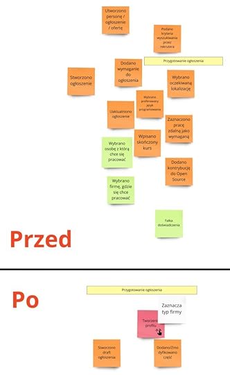 Skupiłem się na tym, co dzieje się w samym systemie, czyli że ogłoszenie zostało stworzone albo że została złożona oferta. Andrzej przyjął zupełnie inną taktykę: szukał, co musiałoby się wydarzyć w życiu programisty, żeby zechciał skorzystać z naszego narzędzia. Tym sposobem na drzwiach pojawiły się takie zdarzenia jak „Toxic PM detected”, „Ruby/Elixir experiment started” czy „Interested in remote”.