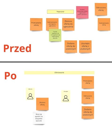 W kolejnym kroku oddzieliliśmy kreską wyniki pierwszej sesji. Pod nią umieściliśmy tylko te zdarzenia, które faktycznie zmieniają coś w systemie, czyli zdarzenia domenowe. Przy okazji pozbyliśmy się duplikatów. Postanowiliśmy też nie przenosić niżej zdarzeń z funkcjonalności, których nie chcemy od razu implementować w nowym systemie. Jako wynik otrzymaliśmy uporządkowany przyszły proces biznesowy, z uwzględnieniem pierwotnego modelu biznesowego.