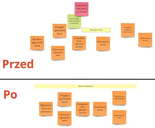 Zostały nam jeszcze tylko dwa mniejsze procesy do omówienia: banowanie rekruterów i weryfikacja umiejętności kandydata. Warto zauważyć, że umieściliśmy je najpóźniej na osi czasu, ale tak naprawdę każdy z nich może wystąpić w dowolnym momencie całego procesu biznesowego. Nieraz warto to zaznaczyć jakąś notacją. My tego nie zrobiliśmy.