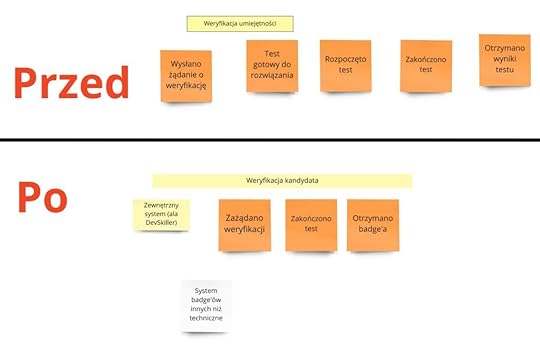 Na potrzeby serii naszych postów zdecydowaliśmy się zawrzeć go w pierwszej wersji produktu, ponieważ wydaje się ciekawym miejscem na pokazanie integracji z zewnętrznym systemem. Może to być też proces mocno rozciągnięty w czasie. Skoro ogłoszenia są zamieszczane anonimowo, chcielibyśmy dać programistkom i programistom szansę wyróżnienia się przez pewnego rodzaju wstępne potwierdzenie umiejętności. Innymi słowy, istniałaby możliwość zdobywania odznak (badge) dzięki integracji z takimi systemami jak DevSkiller. W tym przypadku zdarzenia mówiące o gotowości do testu i samym rozpoczęciu testu zostały usunięte. Stało się tak dlatego, że są to zdarzenia spoza naszej domeny i należą do zewnętrznego systemu, z którym się integrujemy. Z naszej strony chcielibyśmy wyłącznie zainicjować weryfikację, a następnie dostać wynik, gdy dostawca usługi zakończy proces.