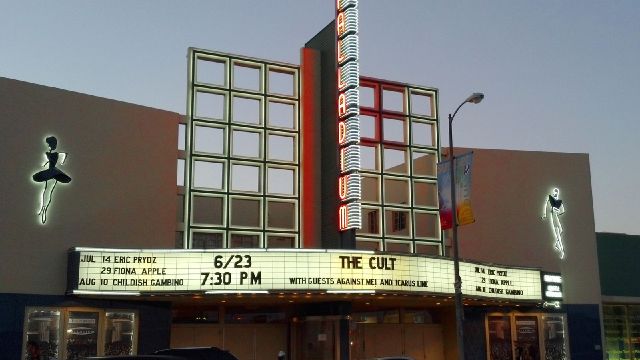 For me, The Hollywood Palladium fit right into my new wave sensibility. I could easily see the evolution from Sinatra to Morrissey, from Zappa to Talking Heads. A Ho-Hum Interlude: While I regret the loss of what once was, from The New Florentine Gardens to Madame Wong's, I guess purgatory is worse. Just a brief history of what I still refer to as The Aquarius Theater. Opened in its art deco setting in the 1930, The Errol Carroll Theater was one of golden Hollywood's icons, like the sign and The Magic Castle. The theater's slogan is a gem of a by-gone era: "Through these portals pass the most beautiful girls in the world." The signage out front was a 39 foot neon of one of those beautiful girls, Beryl Wallace. When Errol Carroll died in 1948, the club became the even more famous Hollywood Moulin Rouge. By the 60's the club became the ABC studio for Hullaballoo, a teen dance program, before it was transformed into The Aquarius Theater for the musical Hair. The Doors played their most famous shows at the Aquarius (and also under its former banner The Kaleidoscope, which only lasted for a few months). The theater would have bursts of energy throughout the 80s, but, and here's where ho-hum begins, it was transformed in Nickelodeon's L.A. studios in the mid 90s. Today Nickelodeon has all but abandoned the property and the famous building's fate remains unknown.