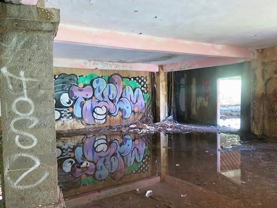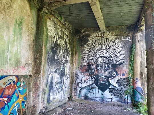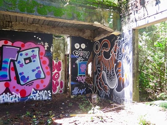 We walk slowly towards a few more graffitied shattered buildings, take some photos, and then decide we have had enough. We are both quiet, contemplating. As we ride home, we both exclaim: holy s…, what was that place all about?!