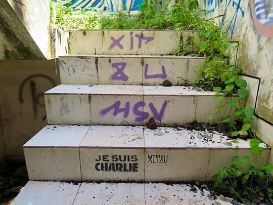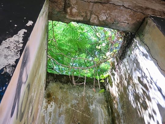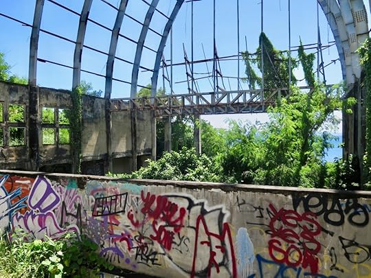 As we walk further into the park we are met by enormous ruined buildings with shattered windows and missing roofs. Vines, tropical flowers, and large branches with giant leaves are growing in and around them, and the broken concrete walls are covered in colorful graffiti art; some of it absolutely amazing. We are both in awe. The beauty of the decay combined with the lush tropical plants and the colorful graffiti is breathtaking. We are quietly taking photos and walking slowly through what used to be a huge atrium. The stairs to the second floor are still partly intact, yet overgrown with green leaves, so we carefully walk upstairs. The view of the vast ocean and the colossal ruin covered in greeneries that meets us is sublime, breathtaking.
