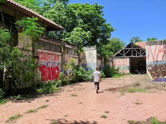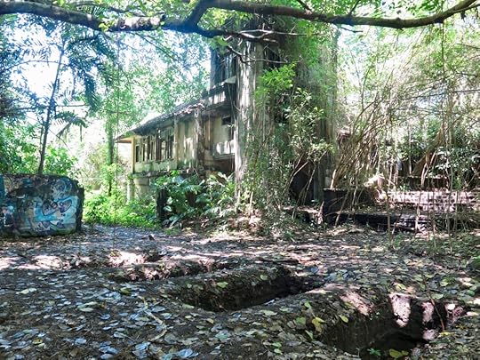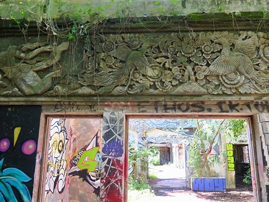 We decide to continue and pass through a gate covered in thick vines and leaves and enter a courtyard. Strange holes are dug in the soil – they look like freshly dug graves and my son and I send each other a bewildered look. What are those holes for? He asks me. No idea, I say, should we leave? No, it’s ok, lets walk through here and check out the building over there. He points to some wide steps that lead up to a massive decaying building with a surrounding colonnade. I hesitate for a bit and then nod at him. As we walk through the courtyard, we pass a tall chapel-like building which, strangely, isn’t plastered in graffiti. Plants have almost completely taken over its walls and tropical vines are hanging from the roof. There is a small overgrown passage next to it, and as we look down it suddenly an orange scooter driven by an old Balinese man with grey hair passes. A small boy is sitting on the back of the scooter holding on to the old man. They pass, and then disappear. And we think nothing of it at the moment.