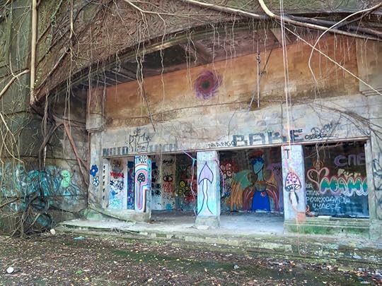We leave the ruined atrium and walk into a square with a shattered fountain in the middle. One can sense the grandeur that this place must undoubtedly have had when it was just built. Another massive building is facing the square and as we approach and are met by an intimidating graffitied snake, we realize that it is the remains of a movie theater. We can enter the darkness of the ruined cinema but feel reluctant. Every intuitive hunch in us screams: no!