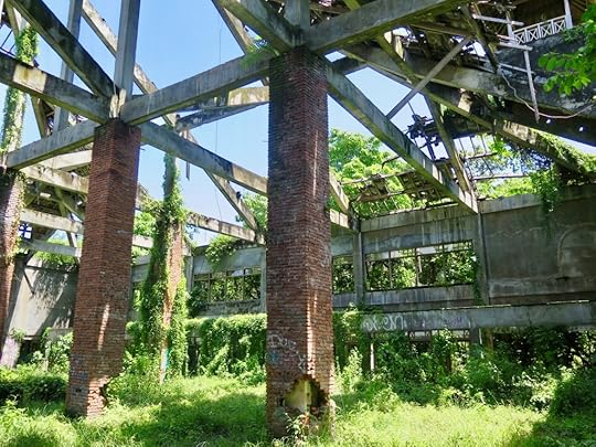 As we walk into the grand crumbling colonnade surrounding the massive structure swallows fly out towards us, and bats are hanging from the ceiling. I am really not a big fan of bats, and my son knows, but he says: let’s just check out the open area, then we can leave. I nod, and we continue. The ground of colonnade is covered in rainwater and the graffitied walls are reflecting in the water giving the sight an illusion of abolition of up and down. We walk into the massive demolished center of the building; the iron structure is the only thing still standing and loose pieces of timber are hanging from it, giving it a very unsafe look.