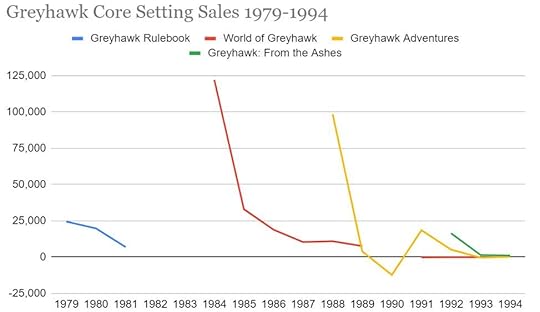 RT @BenRiggs_: Behold! Sales numbers for Greyhawk and Oriental Adventures!The first chart is a sales comparison of core Greyhawk setting releases between ‘79 and ‘94.