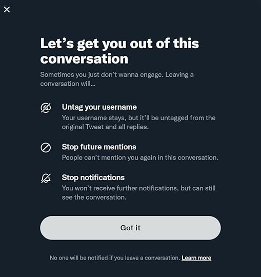 Looking to further hedge yourself against harassment and abuse while on Twitter?You can literally remove yourself from any Mentions, even conversations you haven't engaged with (and even your own conversations!) by clicking the three dots.