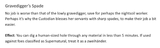 Sacred Remnants are relics of a forgotten past; from a time when the Covenant of gods was unified. They were kept mostly by priests but some were gifted to the faithful.Today, Sacred Remnants are kept safe by their descendants. Here is one such example: the Gravedigger's Spade