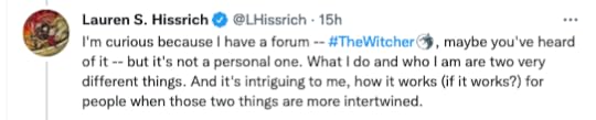 I have been reading this exchange between Lauren Hissrich – showrunner of #TheWitcher – and The Quartering. During the exchange, something hit me, and I find it a fascinating insight into fandom.This is not an opinion about politics, but one about being a working creative:🧵