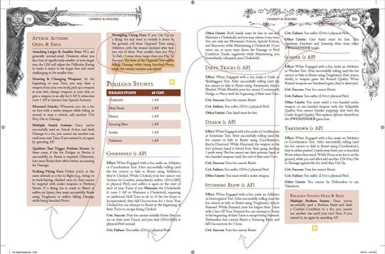 This is my favorite part of TTRPG design: first pages review!My focus is to ensure that we have clarity in content, that spreads fit evenly across the page, and all related actions has their contents nested beneath of it. Yellow notations are art placement notes.