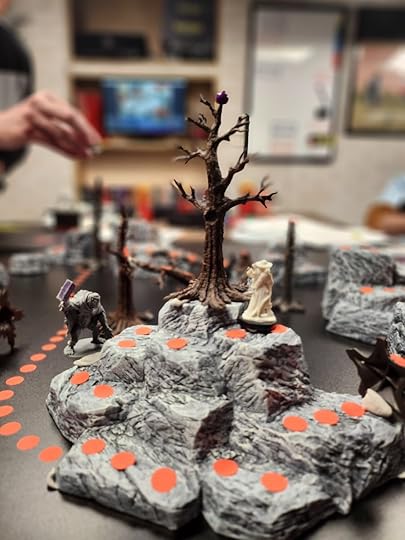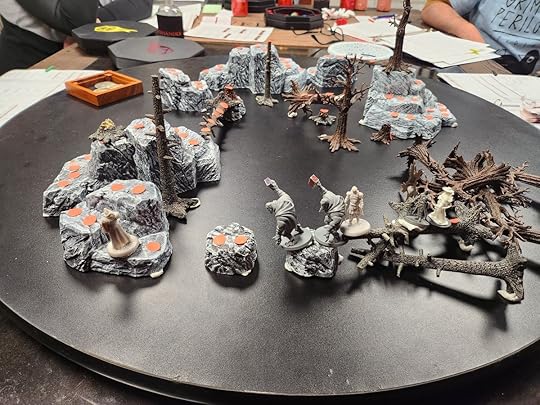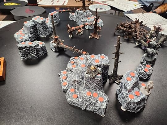 Last night was A WILD night for Zweihander TTRPG! The PCs were racing with a pair of ogres across a ravine. They lept between stones, rocks, and fallen trees to retrieve a precious amulet.I used orange dots on the terrain to indicate hexes/squares.Terrain by @MonsterFight31 https://twitter.com/i/web/status/1618678270018600960