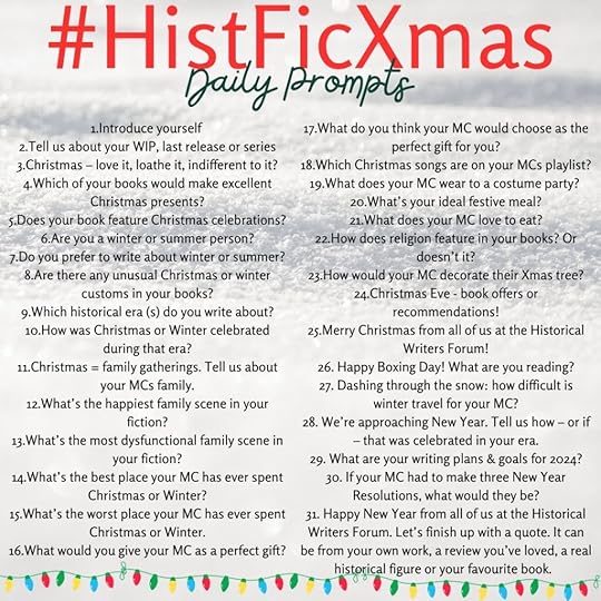Well, as suspected, I’m well behind with the #HistFicXmas, or snippets about my books and characters prompted by the list from the Historical Writers Forum: