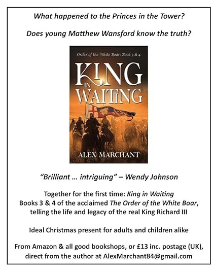 Alex Marchant is author of two books telling the story of the real King Richard III for children aged 10+, The Order of the White Boar and The King’s Man, and a third in the sequence, King in Waiting, which continues the adventures of the young members of the Order in the following years. A fourth book, Sons of York, was published in June 2022 and offers a ‘plausible theory’ for the fate of the ‘Princes in the Tower’.