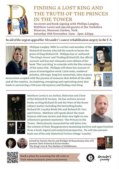 On Saturday 19th November, two of my very favourite Ricardians – Philippa Langley and Matthew Lewis – are giving talks and signing their books at the Yorkshire Museum to raise funds for young Alexander Goodwin’s upcoming surgery in the USA.