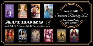 Please join me and the debut authors 18 group to celebrate the release of our summer books! We’ll be getting together on Facebook for a few hours to talk about the books and giveaway prizes.