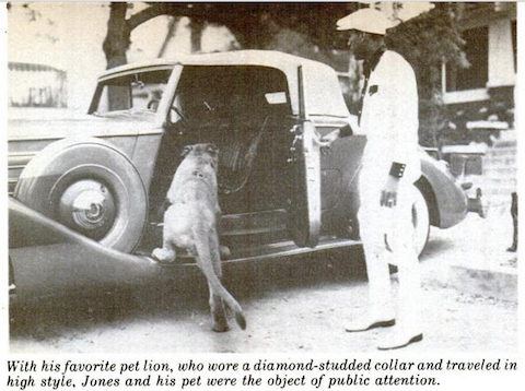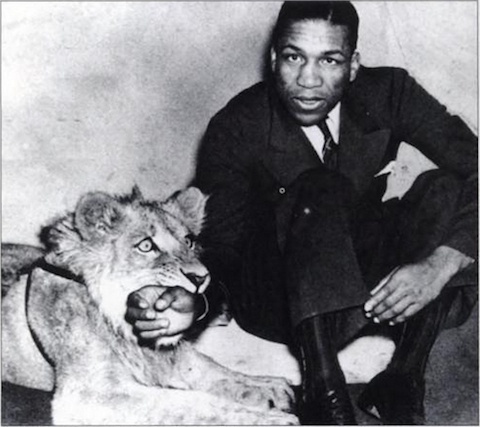 While recently listening to a few selections from Mae West’s misguided rock album, I came across the tale of one of her associates, a middleweight boxer by the name of Gorilla Jones. The exact nature of Jones’ relationship with the famously libidinous West is hard to establish—he has variously been mentioned as her bodyguard, her managee, and one of her long-term lovers. What is known for sure is that West’s money helped fund Jones favorite hobby: collecting lion cubs, which accompanied him virtually everywhere he went. The fascinating Mike Mazurki chips in his recollection of Jones’ feline predilection here: