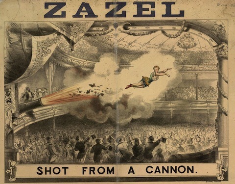 The human cannonball act is one of the most notoriously dangerous in all of circus-dom; performers have little to no control over their movement, so any minute error in firing trajectory is certain to cause catastrophe. The legendary Zazel, née Rossa Matilda Richter, was thus fortunate to survive her 19th-century career, though she did break her back while working for P.T. Barnum. Per this source, however, Zazel could have easily satisfied the English masses by simply removing a few articles of clothing, rather than risking life and limb: