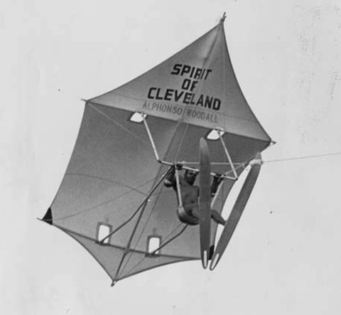 There are few more colorful characters in recent modern Cleveland history than Alphonso Woodall, a daredevil who performed as “The Human Kite.” A former Army Air Force mechanic, Woodall built his own rig so he could soar above Lake Erie with water skis strapped to his feet. His derring-do eventually attracted the interest of a B-grade reality show called You Asked for It, which agreed to pay Woodall $500 for his act—though over dry land, attached to a car instead of a boat.