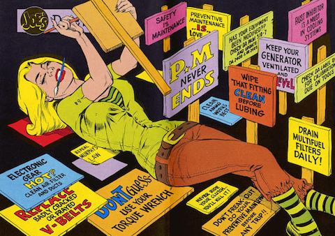 The Army knew better than to stick a talent like Will Eisner in a foxhole. The artist was allowed to serve his country from behind a drawing board, where he was the chief creative force behind a series of comic instructional manuals. The best-known of these was Preventive Maintenance Monthly, the highlight of which was always Eisner’s single-panel “Joe’s Dope Sheet” feature. The star of “Joe’s Dope Sheet” was the unnamed woman above, who somehow managed to make gasket-tightening seem quasi-pornographic. I’m especially fond of this installment, in which the woman castigates a pint-sized soldier for installing the wrong cable control unit on his bulldozer. Though Eisner was also capable of much more overtly titillating fare, too.