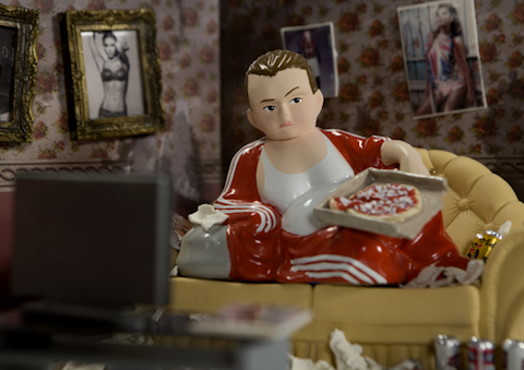 Given that I'm all about narrative arc these days, Barnaby Barford is an artist who's right up my alley. He uses his ceramic skills to tell stories, and his latest project is a doozy—a modern update on A Rake's Progress that recounts an English lottery winner's rise and fall. One moment our protagonist is sitting on his couch, watching Newcastle United on the telly while his missus bugs him about a zillion unpaid bills; the next he's living the high life in a casino, blowing his winnings on pleasures of the flesh. This inevitably leads to a classic downward spiral, as the man—a cross between Andy Capp and a rather noxious sort of chav—lacks the fortitude to control his impulses.