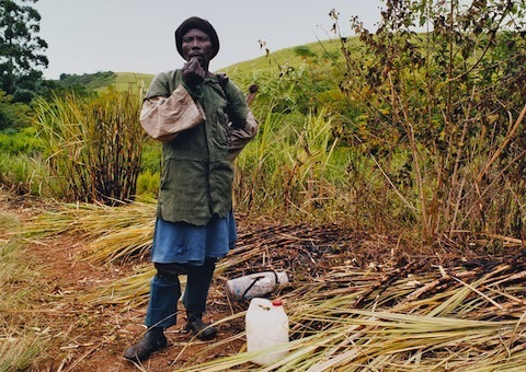 My first attraction to the sugar cane workers was that they were wearing skirts, and that they looked to me like Samurai worriers. I then found out that, not only were they wearing skirts, but also many other layers of clothing. This was odd to me because Durban is an incredibly hot and humid area. I thought they must be crazy to be wearing so many clothes and still doing manual labour. I discovered, through speaking with them, that the reason was to protect themselves from the burning ground and soot (sugar cane is burnt before harvested); from the very sharp leaves of the cane; and also from the many snakes that like to live in sugar cane fields. The most difficult part of taking these photographs was stopping them from working. These guys are paid according to the weight of sugar cane that they harvest; there is no hourly rate. I felt guilty that I was interrupting and taking their money away from them by asking them to pose for me. So this forced me to move in and out as quickly as possible, interrupting their flow of production as little as possible.