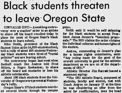 One of the many historical realms I'm trying to bring to life in the next book is that of Oregon's Vietnam-era college scene. And one of that scene's biggest controversies was that involving Fred Milton, an Oregon State University football star who refused his coach's demand that he shave his beard—in the off-season, it's important to note. When Milton's stance led to his dismissal from the team, the school's Black Students Union called for a university-wide boycott until he was reinstated. Yet only a small fraction of Oregon State's 14,000 students heeded this request. And so every single black student on campus—all 47 of them—left school to protest Milton's treatment, causing a tremendous stir.