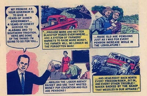 In 1960 Ater traveled to Alabama to meet with George Wallace, who was running for governor. By Malcolm's retelling, Wallace leaned across his desk and stated "I don't see how a damn Yankee like you can come down here to Alabama and help me get elected." Ater replied "Well, Judge, if you'll recall, I came down here a few years ago and worked for John Patterson and helped defeat you!" Wallace and he became friends and the result was the comic Alabama Needs the Little Judge, George Wallace for the Big Job. This book is pro segragationist and in it Wallace promises to send "back north every freedom rider, sit-in, and every other troublemaker" sent by NAACP.