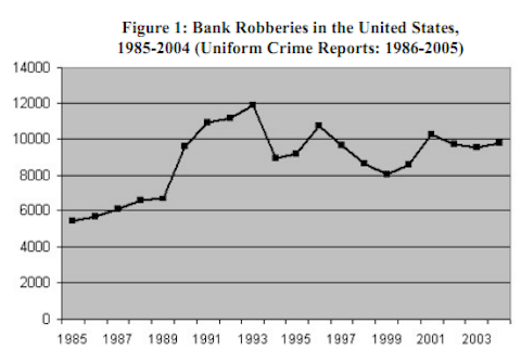 That isn't to say that all those crafty anti-robbery techniques have been for naught. A big factor in the crime's growth seems to be the proliferation of small suburban branches, where police response time is much greater than in central areas. Without innovations such as single-door entryways, dye packs, and greeters, there's no telling how high the rate might be today.