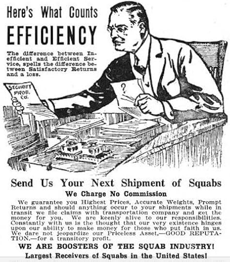 Had the scheme's victims bothered to look back at the history of squab farming, they would have quickly realized that Galbraith was a con man. This was not the first time that men and women had been artfully duped by salesman stating that the Squab Renaissance was about to occur. In the 1920s, there was a massive squab bubble in the United States, as dozens of companies popped up to offer their services as bird brokers. Newspapers published regular reports on squab prices, and passed along the U.S. Department of Agriculture's assurances that this time, the forthcoming squab boom would really, truly happen: