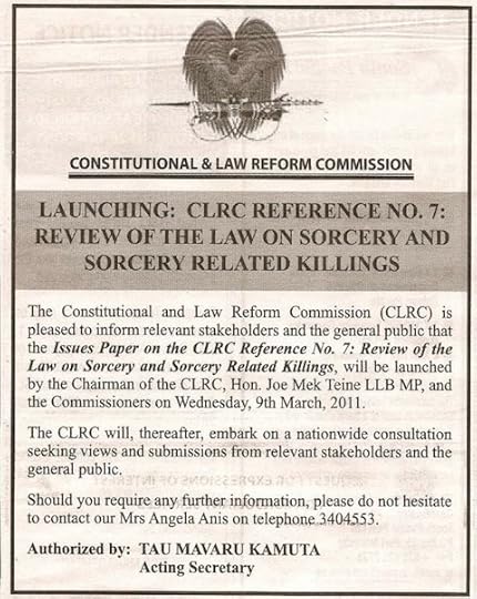 I've previously written about the continued existence of anti-sorcery laws in the Vanuatuan penal code, so I felt compelled to post about the current debate in Papua New Guinea over similar statutes. The PNG government has grown increasingly alarmed over a rash of murders linked to beliefs in witchcraft: