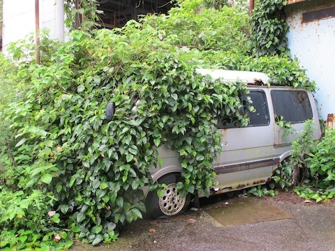 Whereas Hashima was deserted in a matter of weeks after its local coal mine closed, Ikeshima still claims approximately 220 residents despite the closing of its own coal operation in 2001. Without any economic engine, of course, there is nothing to attract new residents, or to retain those who might dream of something better than simply holding on to what they always knew. But a few loyalists do remain, and last year the great blog Spike Japan paid a visit to their beloved, increasingly decrepit hometown. The trip produced a bunch of haunting photos, as well as an interview with a rare local optimist who believes that redemption is right around the corner: